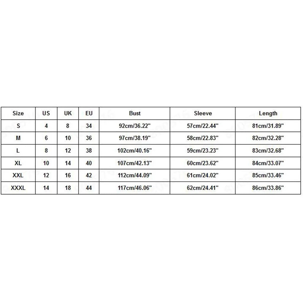| Size | US | UK | EU | Bust | Sleeve | Length |